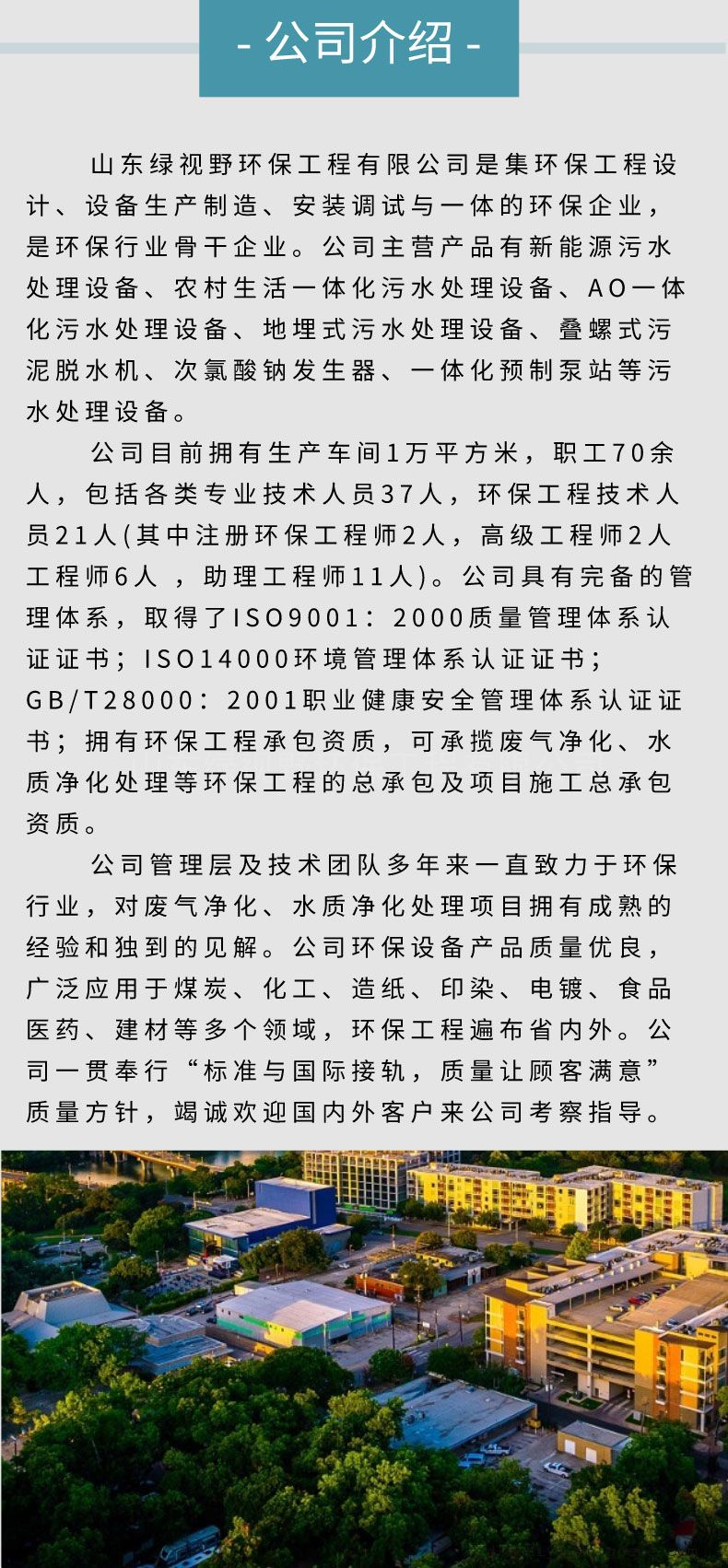 绿视野一体化污水处理设备采用国际先进的生物处理工艺,集去除BOD5、COD、NH3-N于一身,具有技术性能稳定可靠,处理效果好,投资省,占地少,维护方便等优点。 -